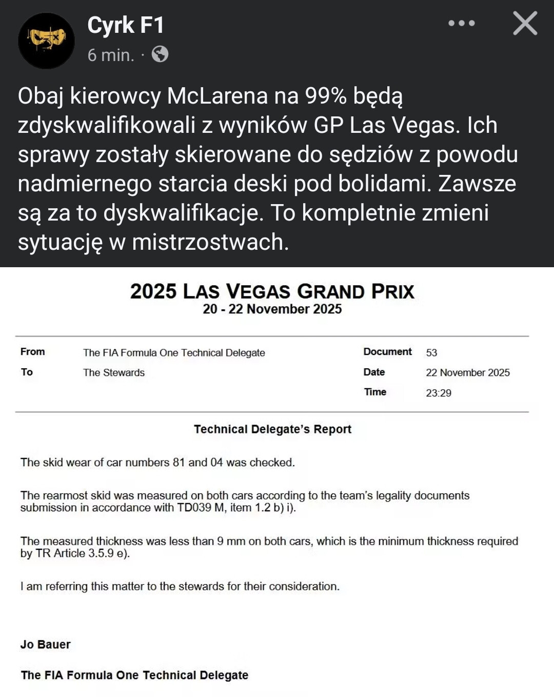 Wyciekło nagranie, w którym Zak Brown próbuje bezskutecznie interweniować u szefa Formuły 1 w sprawie możliwej dyskwalifikacji Norrisa i Piastriego.