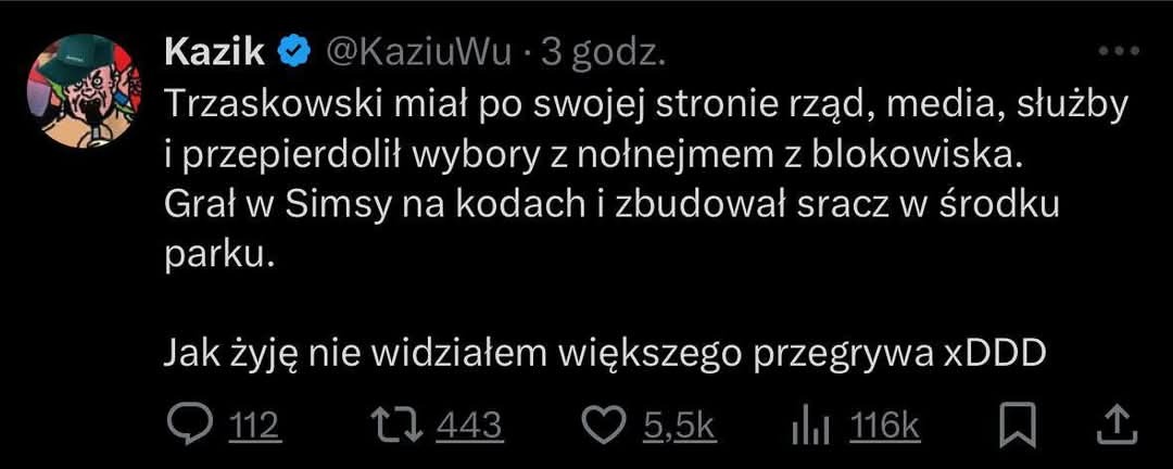 Jak c-----y musi być trzask skoro przegrał z rzekomym gangsterem, sutenerem, wyludzaczem mieszkań, majac po swojej stronie media i telewizje, zagraniczny kapitał który kupował mu szkalujące reklamy przeciwnika, wstrzymywane pieniądze na kampanię PiSu i jeszcze jego krzywe poglądy przykryło p--o z mentzen.
