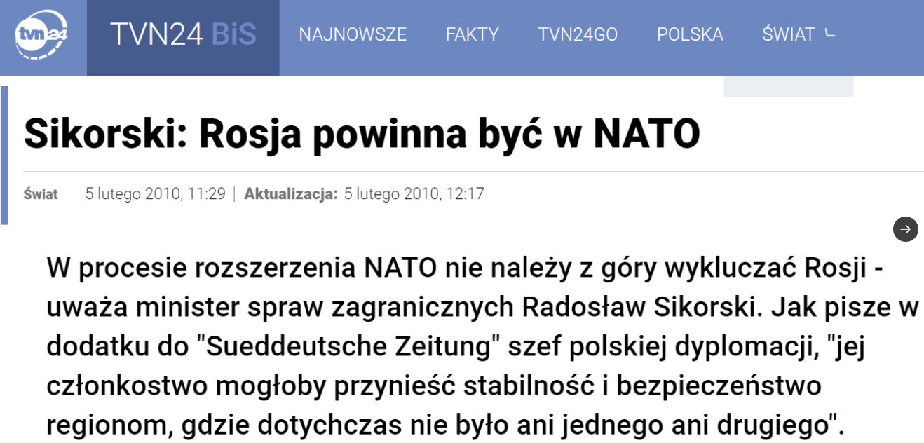 "Wybitny historyk i znawca Rosji prof. Andrzej Nowak tak podsumował Sikorskiego: „Uważał, że rozmawiać trzeba z silniejszymi sąsiadami, z Rosją i Niemcami, nawet na kolanach (…), a na słabszych można krzyczeć albo ich zignorować”. Sikorski szukał porozumienia z Rosją kosztem Litwy i Ukrainy. Upokarzał te państwa, na co wobec Rosji nigdy się nie odważył, a wręcz zachowywał się jak wasal Siergieja Ławrowa, z którym się spotykał, a nawet zaprosił jako mentora dla