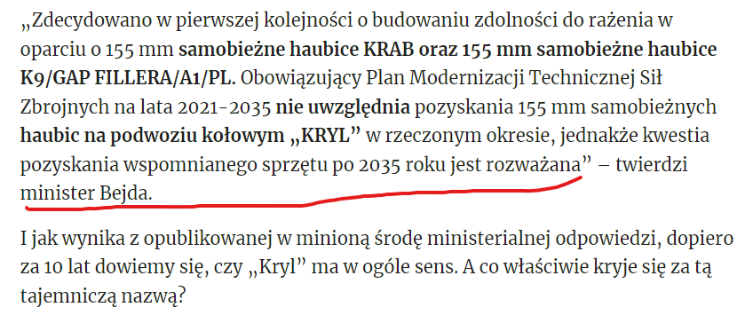 Polski przemysł zbrojeniowy nie zarobi na produkcji armatohaubic z programu „Kryl”, które uzupełnić miały siłę obronną Wojska Polskiego. Resort obrony stara się tłumaczyć, czemu zrezygnowano z tej polskiej konstrukcji.