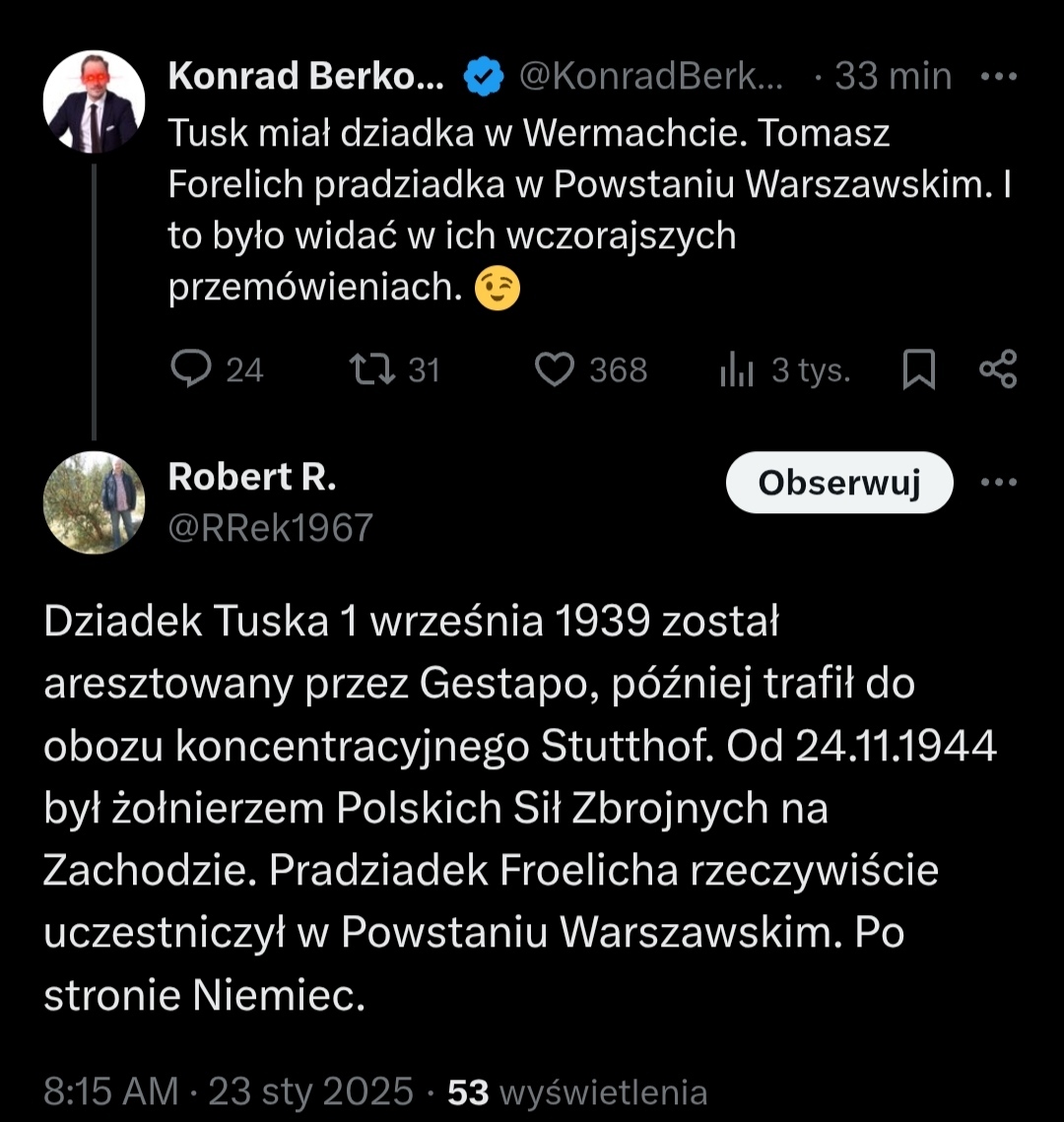 @CipakKrulRzycia: Pradziadkiem Tomasza Froelicha jest polski wynalazca i uczestnik wojny polsko-bolszewickiej Adolf Froelich. Z kolei jego drugi pradziadek Marian Kornet, pseudonim „Trąbka” walczył w Powstaniu Warszawskim w zgrupowaniu Krybar.