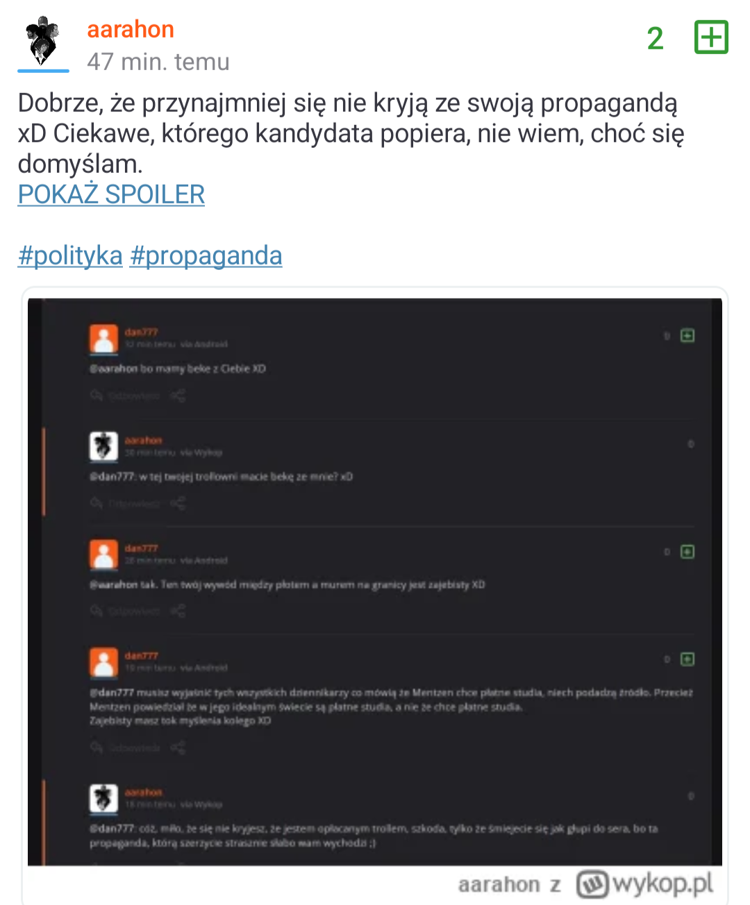 #polityka #propaganda #aarahon Oświadczenie Generalnie chłopa wyśmiałem jaki ma tok rozumowania. Chodziło o zdjęcie które umieszczę w komentarzu. Pokazałem jego wypowiedzi mojej żonie ( bo niektórzy na wykopie jednak mają żony) MieliśMY z niego beke, a on że " MY" oznacza trole z kremla XD Jeszcze mnie zablokował, żebym go nie skompromitował ( ͡º͜ʖ͡º)