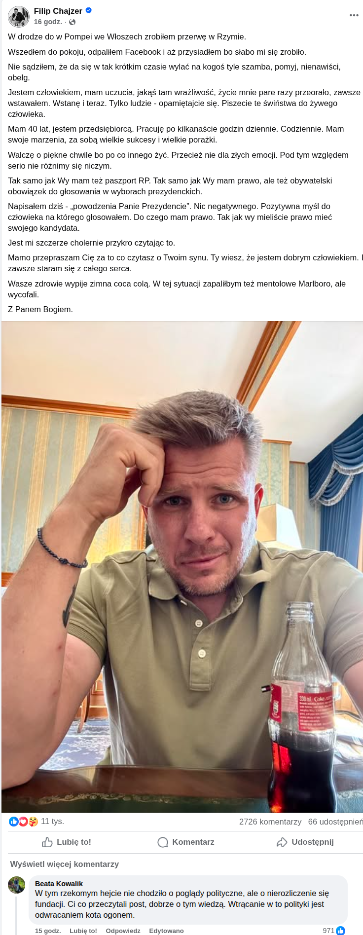 Filip Chajzer Stacja XII - 'Uronił łzę na wakacjach we Włoszech i przepraszał mame że musi czytać te hejty...Z Panem Bogiem" A tak serio to ludzie sadzą się do defraudacji 700k zł w jego fundacji a chłop podciąga to pod polityczny atak bo poparł wczesniejszym postem Nawrockiego ;P Nie wiem, ale może liczy że będzie jakieś ułaskawienie jak linia obrony oskarżonego (dyrektor fundacji) sie potwierdzi że podzielili sie tym hajsem 50/50? Pożyjemy zobaczymy.