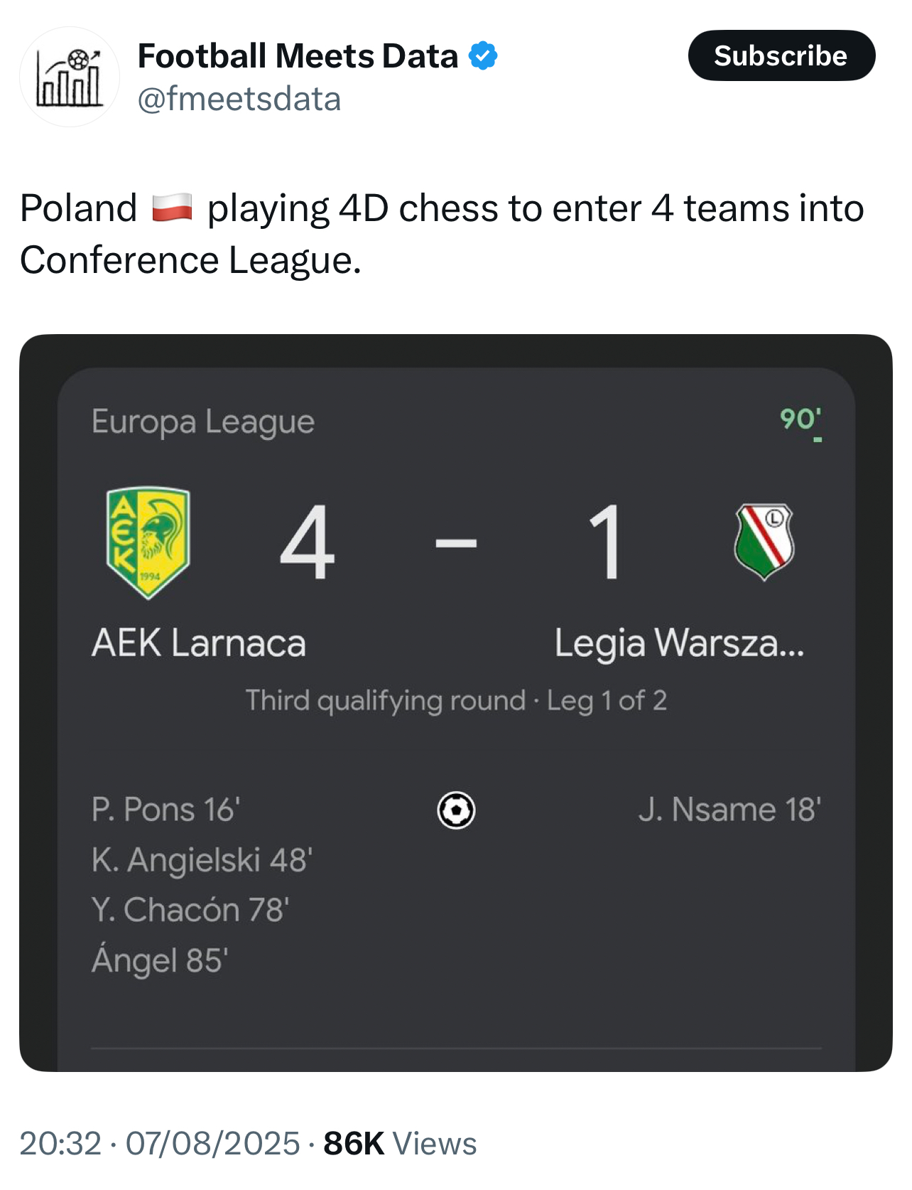 #mecz i tyle z liczenia na 10 miejsce (XD) jak rakow majac taka drabinke przegrywa u siebie z druzyna ktora do mistrza stracila 20 pkt w lidze i mecze w europie nie gra u siebie i jeszcze dwoch czolowych zawodnikow odeszlo po sezonie. legia tez sie skompromitowala ale pewnie wejdzie do LKE bo Partizan/Hiberians to polka nizej jak Larnaka. Jak PL w nastepnych latach utrzyma to top15 to bedzie dobrze