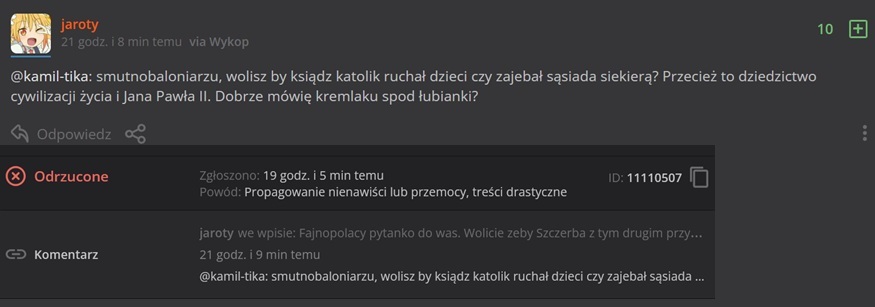 Prosze panstwa ten komentarz zdaniem moderacji nie narusza zasad spolecznosci generalnie wszystko jest gitowa. Juz pomijajac tresc ale wystarczy tutaj tylko napisac to slowo na "z" i "j" zamiec na "y" to i tak nawet jak to slowo uzyte jest bezosobowo to i tak zaraz kasuja a tutaj mamy takie kombo i wszystko spoczko. A sprobuj jeden z drugim skrytykowac Tuska, fajnopolakow albo doktor Mengele z Olesnicy to zaraz cie zabanuja na