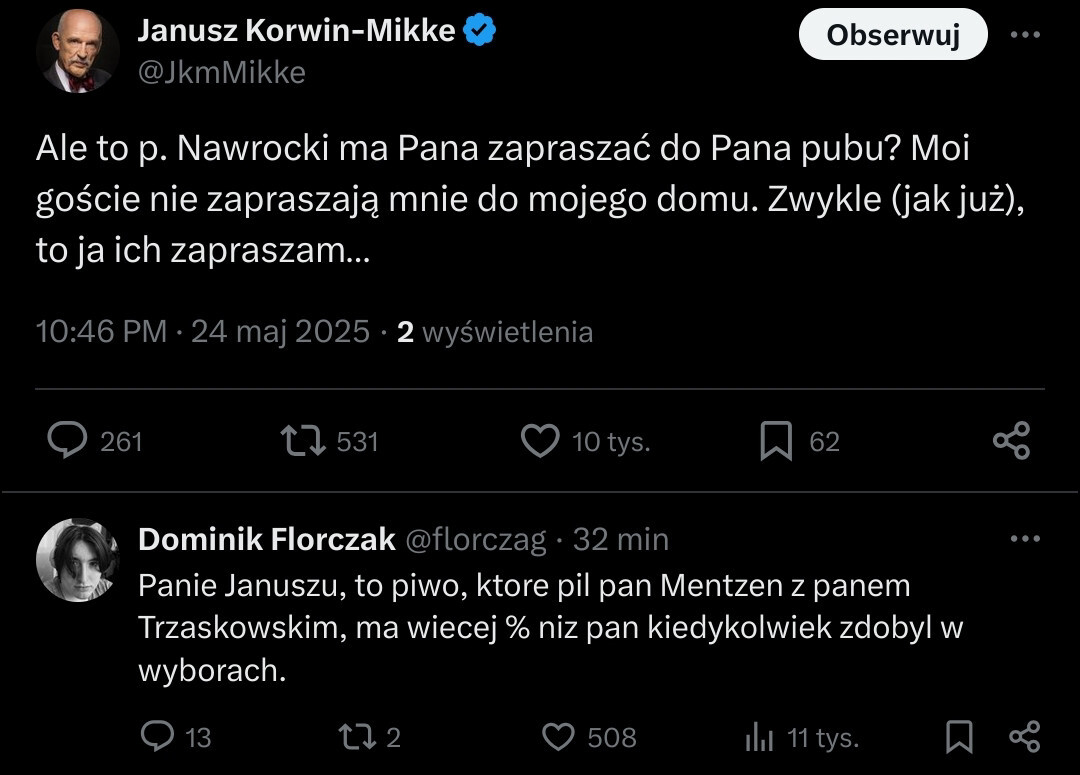 Po tych wszystkich komentarzach widać skalę piętna jakie odcisnęło na narodzie 8 lat pisowskiej goebbelsowskiej propagandy szczucia, bo dla bardzo wielu osób widok dwóch oponentów politycznych pijących sobie piwko w barze to jakaś abstrakcja, według tych osób Mentzen i Trzaskowski powinni się maczetami napieh*alać xD