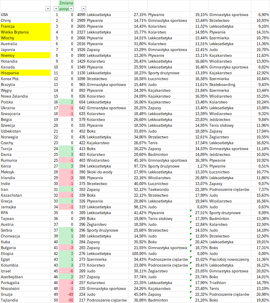 Pora kończyć tę zabawę z tabelkami w ramach #nasiwparyzu #paryz2024 #sport ( ͡°͜ʖ͡°) Poniżej macie czołową 50-tkę ranking olimpijskiego. Ostatni medal Darii Pikulik w kolarstwie torowym wyniósł naszą kadrę na 16-te miejsce. Dokładnie w tym samym miejscu byliśmy w Tokio - przy czym należy pamiętać, że wtedy startowali Rosjanie. W porównaniu z poprzednimi igrzyskami straciliśmy 145 punktów - głównie przez słaby start naszych lekkoatletów.