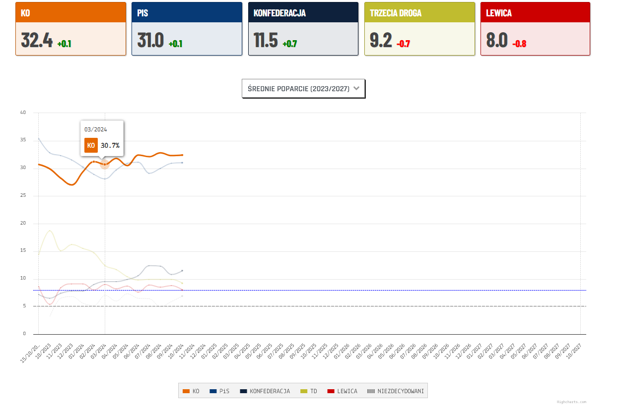 Koalicja Obywatelska cieszy się poparciem 34% respondentów. PiS 25% Konfederacja 12%. Trzecia Droga Hołowni out, Lewica out. Najświeższy sondaż CBOSu.