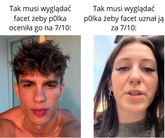 @PowiatowyBanan: xD Właśnie dlatego rynek jest tak r-------y. Żeby baba oceniła chłopa na 7/10 to musi wyglądać jak model a żeby chłop nazwał laske ładną to wystarczy że ma wszystkie zęby