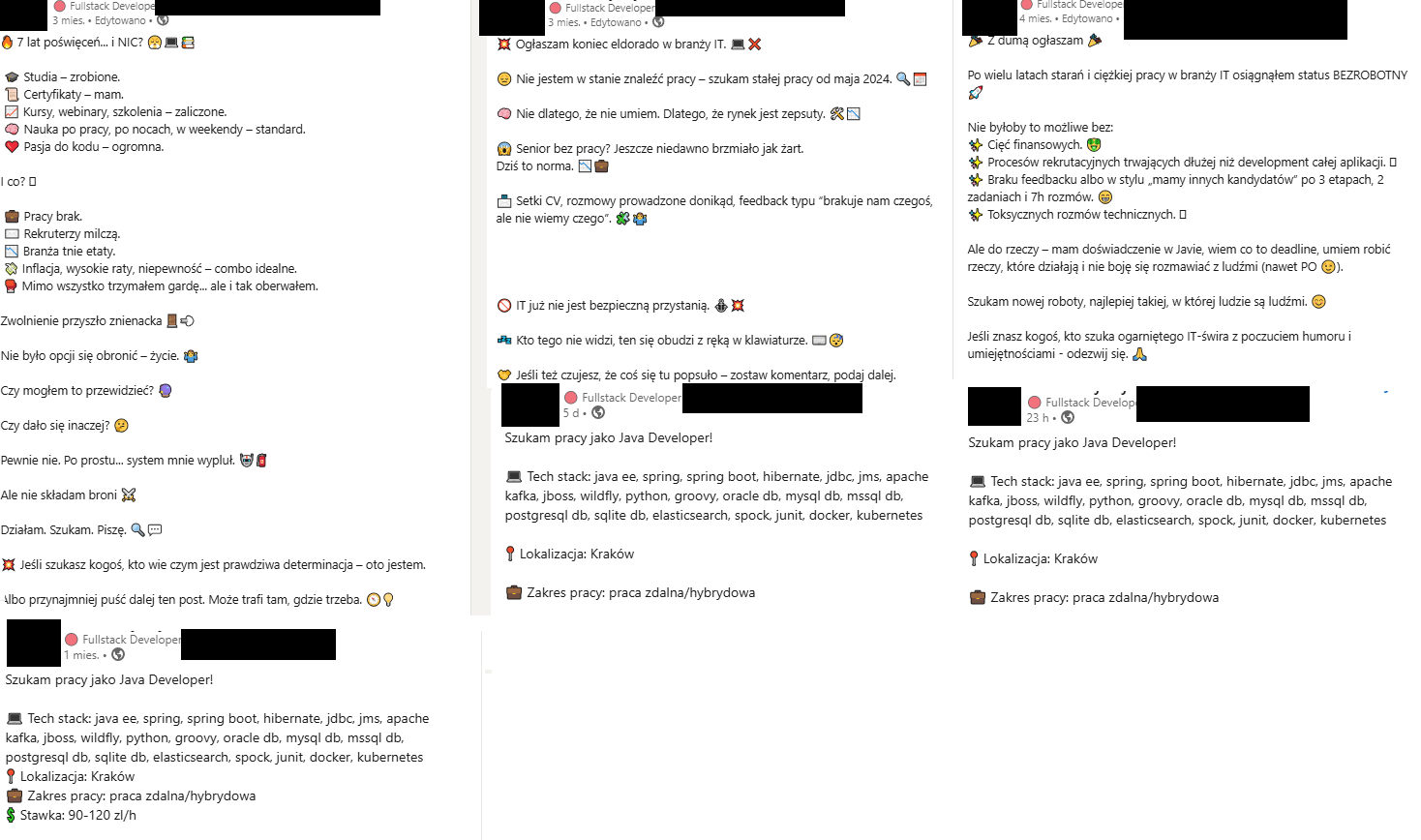 Niby AI to bajka, nie sprawdza się, same koszta, nie zastąpi seniora itd - a linkedin jest pełen ludzi open-to-work. Tutaj mamy przykład seniora specjalisty, który siedzi w branży z pasji, 7 lat stazu, mgr inż informatyki, skill i exp z technologiami które pokrywają się z większością ofert, dobry social skill. W dodatku to nie jakiś tam bootcamper tylko pasjonat który ogarnia, koduje od wielu lat. Ma