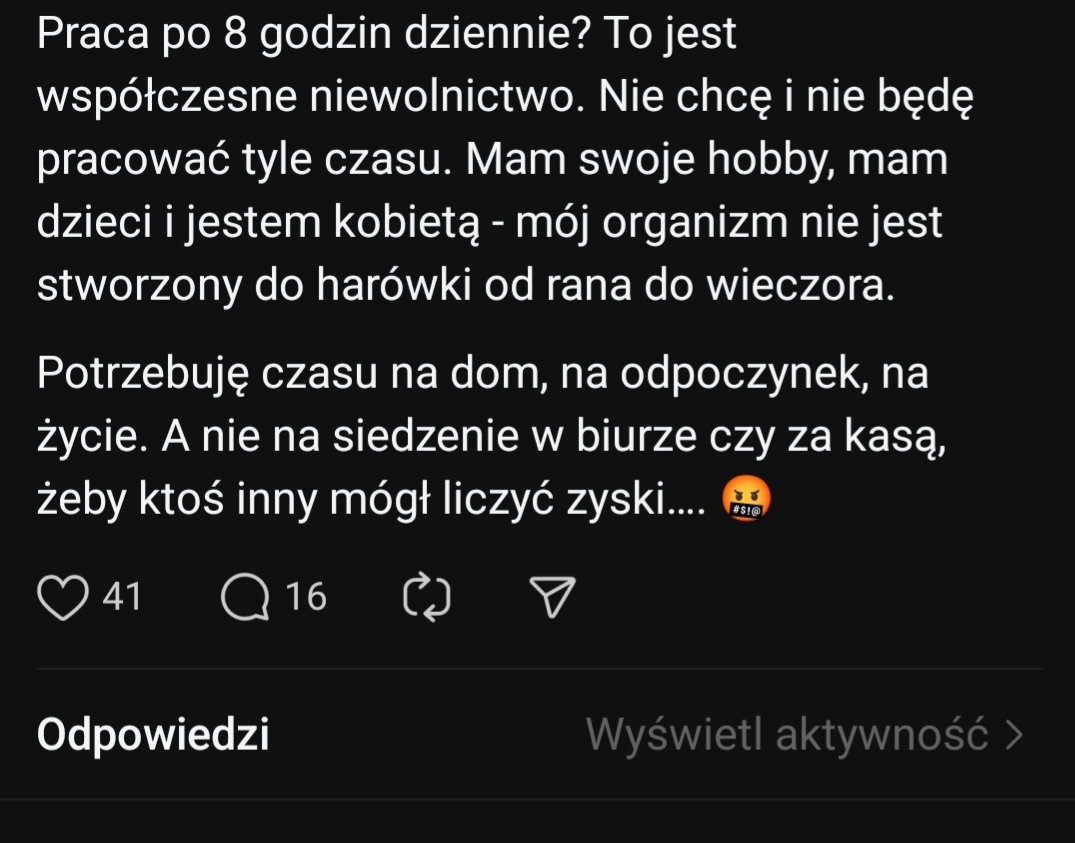 Co o tym myślicie? Ja nie uważam, że praca to niewolnictwo. Nikt nie rozkazuje pracować a już w szczególności na pełen etat po 8 godzin. Tylko skąd ta osoba ma dostęp do internetu, iPhona, pieniądze na nowe ubrania czy na paznokcie. Pracuje się po to, żeby mieć za co żyć. Jeśli ktoś uwaza, że to niewolnictwo to niech żyje i je podstawowe produkty na koszt podatników.