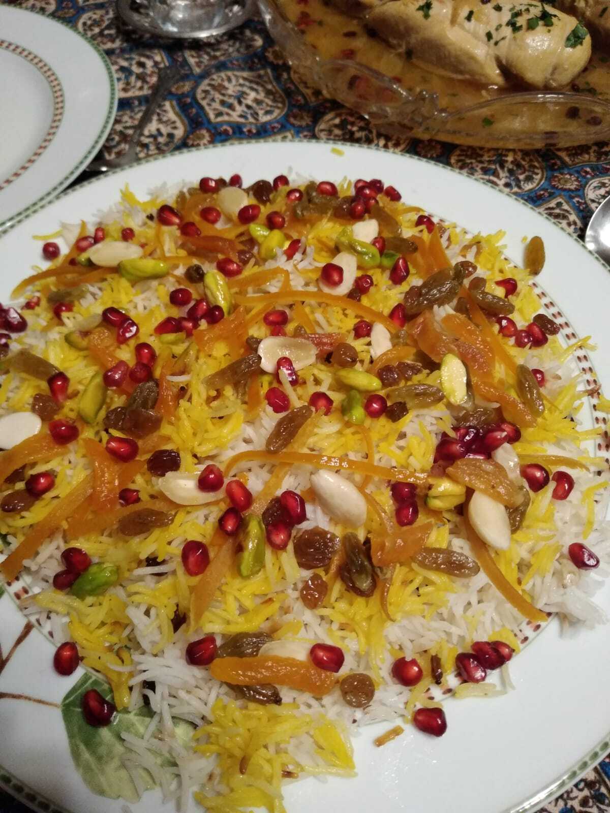 Urodzinowy obiad w irańskim stylu: javaher polow, kurczak duszony w szafranie z cebulą, suszoną cytryną i berberysem, oraz surówka z marchewki, jabłka i pomarańczy #gotujzwykopem