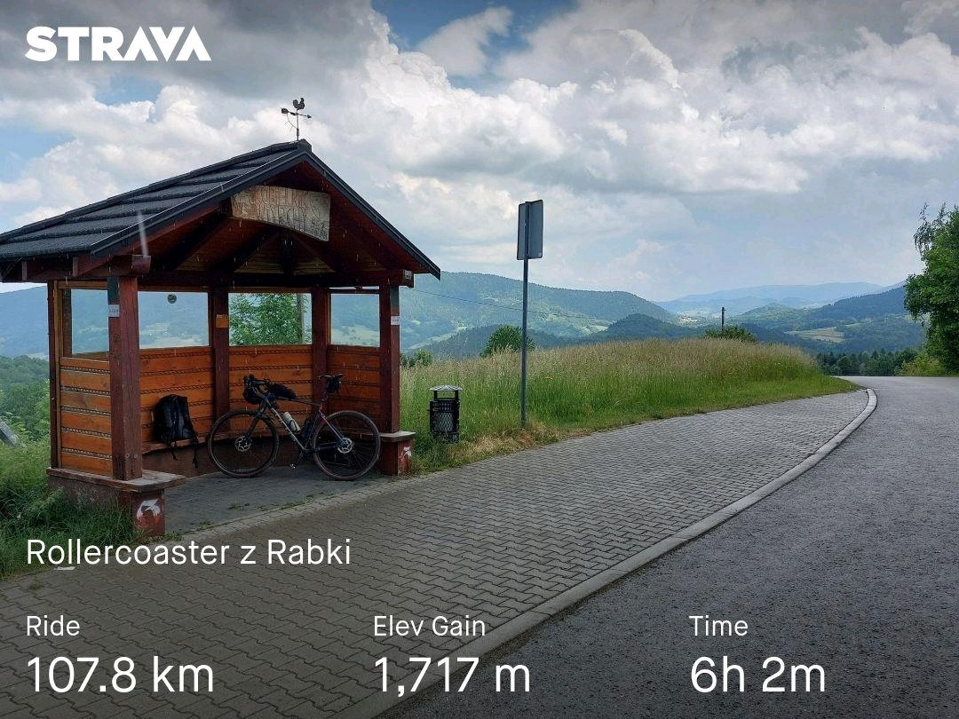 Wczorajsza setka. Luxtorpedą do Rabki, z tamtąd po pagórkach Beskidu Wyspowego i Makowskiego do domu. Wpadło kilka nowych kwadratów. Ostatnie 20 km w deszczu.