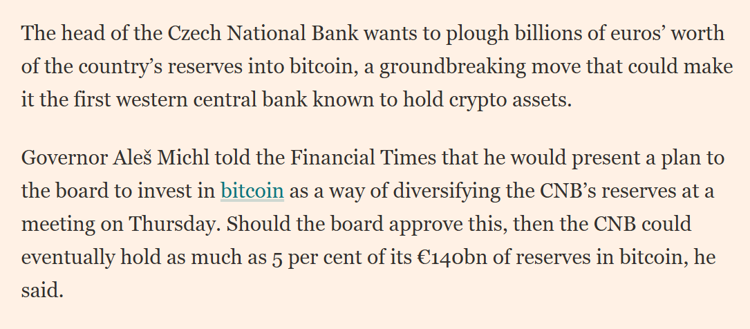 @Bitcoin_za_milion_USD: to zależy, bo wzrost ceny może nastąpić wcześniej skoro jest to "wiadome". Rynki działają tak od zawsze, że dyskontują przyszłe wydarzenia, szczególnie jeśli mówimy o wydarzeniach "prawie pewnych". Co do innych krajów to też nie bądźmy tacy pewni - taka Polska będzie opóźniona ze 20 lat pewnie, a może nawet więcej i nie dożyjemy SBR w Polsce ¯\(ツ)/¯