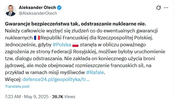 Prawdziwe gwarancje byłyby, gdyby Francja przerzuciła do nas 10 tysięcy żołnierzy i rozlokowała ich w koszarach na wschód od Wisły. Nie oszukujmy się, że ta cała szopka ma bardziej na celu poklepanie nas po plecach przed wyborami prezydenckimi - coś na wzór zdjęcia nawrockiego z trumpem.