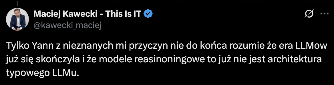 Ja jestem zwykłym magistrem Informatyki i nie mam doktoratu z prawa ani kanału na youtube, więc za krótki jestem żeby zrozumieć co to są modele reasinoningowe i dlaczego nie są to LLM.