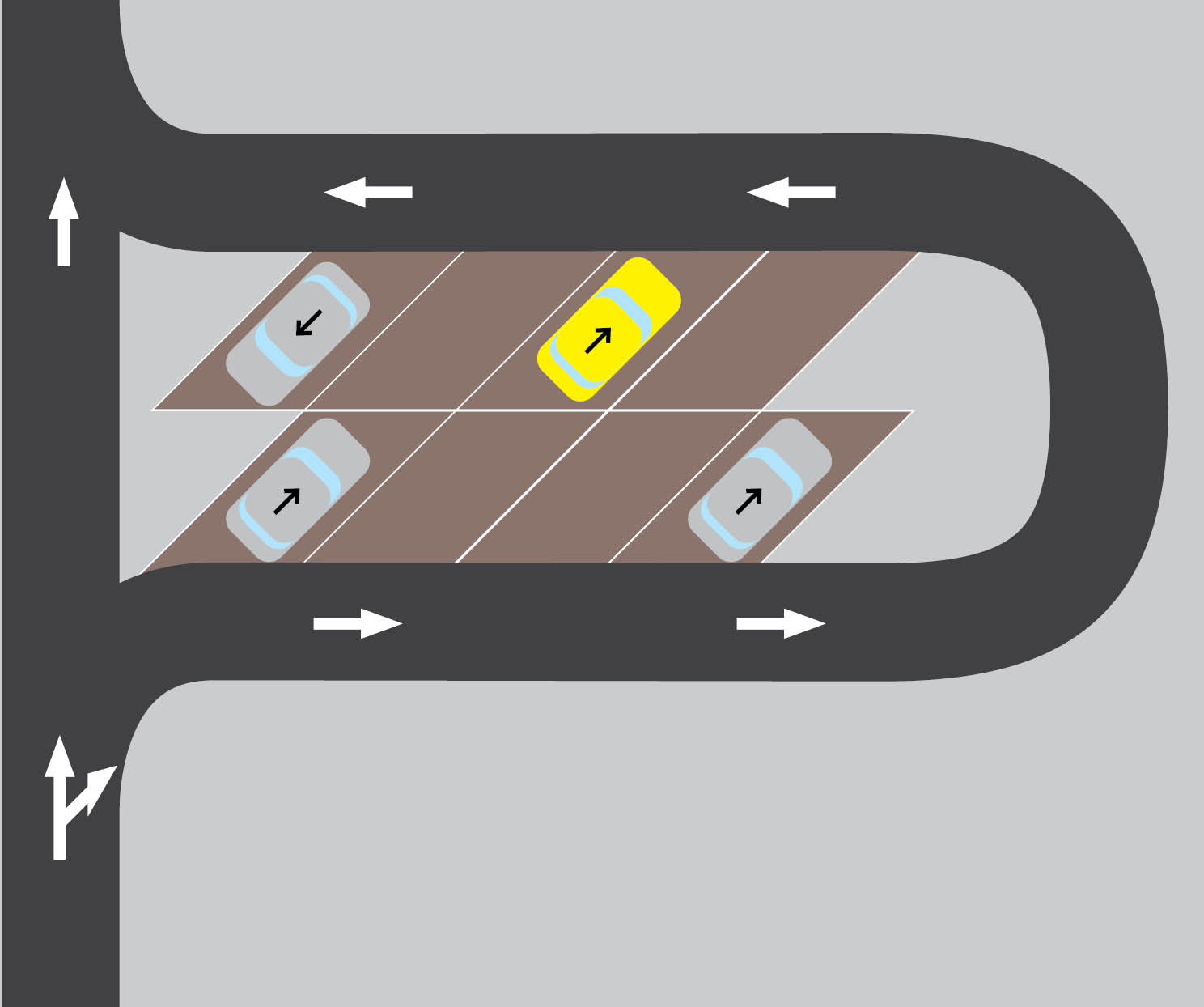 Jest parking pod kątem, który zawraca w drugą stronę. Nie wiem czemu ludzie przejeżdżaja przez pierwsze miejsce parkingowe wjeżdżając w to dalsze bo potem na wyjazd zamiast wycofać łagodnie od tyłu to muszą mocno złamać się do przodu. Tak jak na rysunku żółte auto. PO CO?