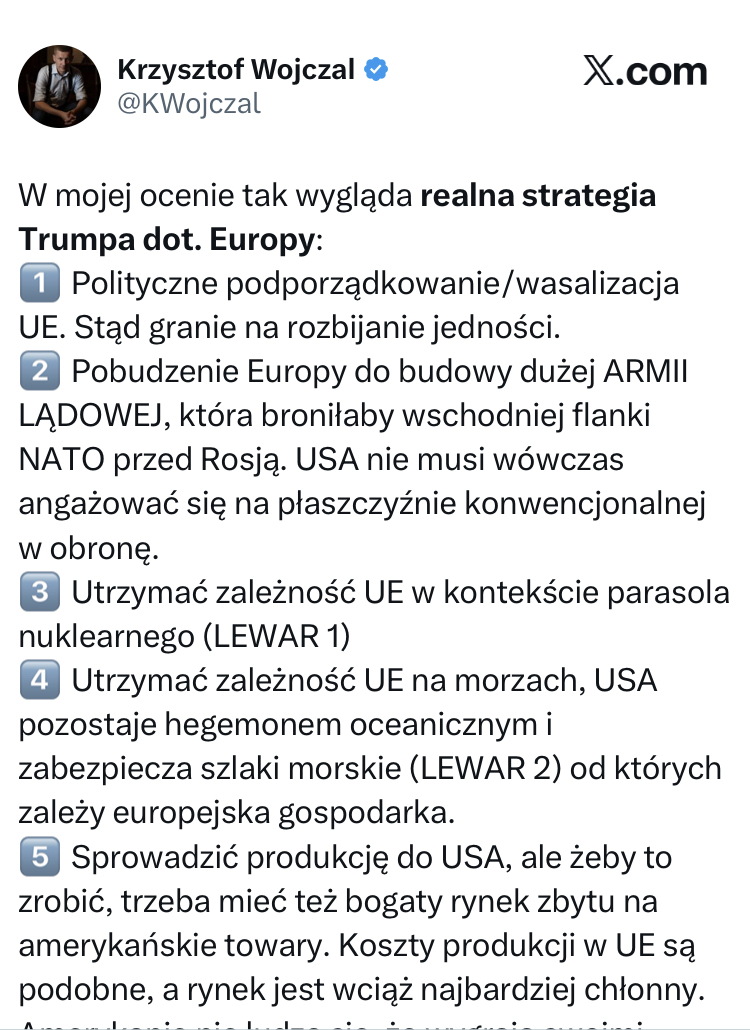 To jest w sumie fascynujące, że Wojczal jako jeden z najbardziej pro-amerykańskich komentatorów bez mrugnięcia okiem opisuje strategię USA wobec Europy jako wasalizację, rozbijanie jedności i nawet mu to nie przeszkadza.