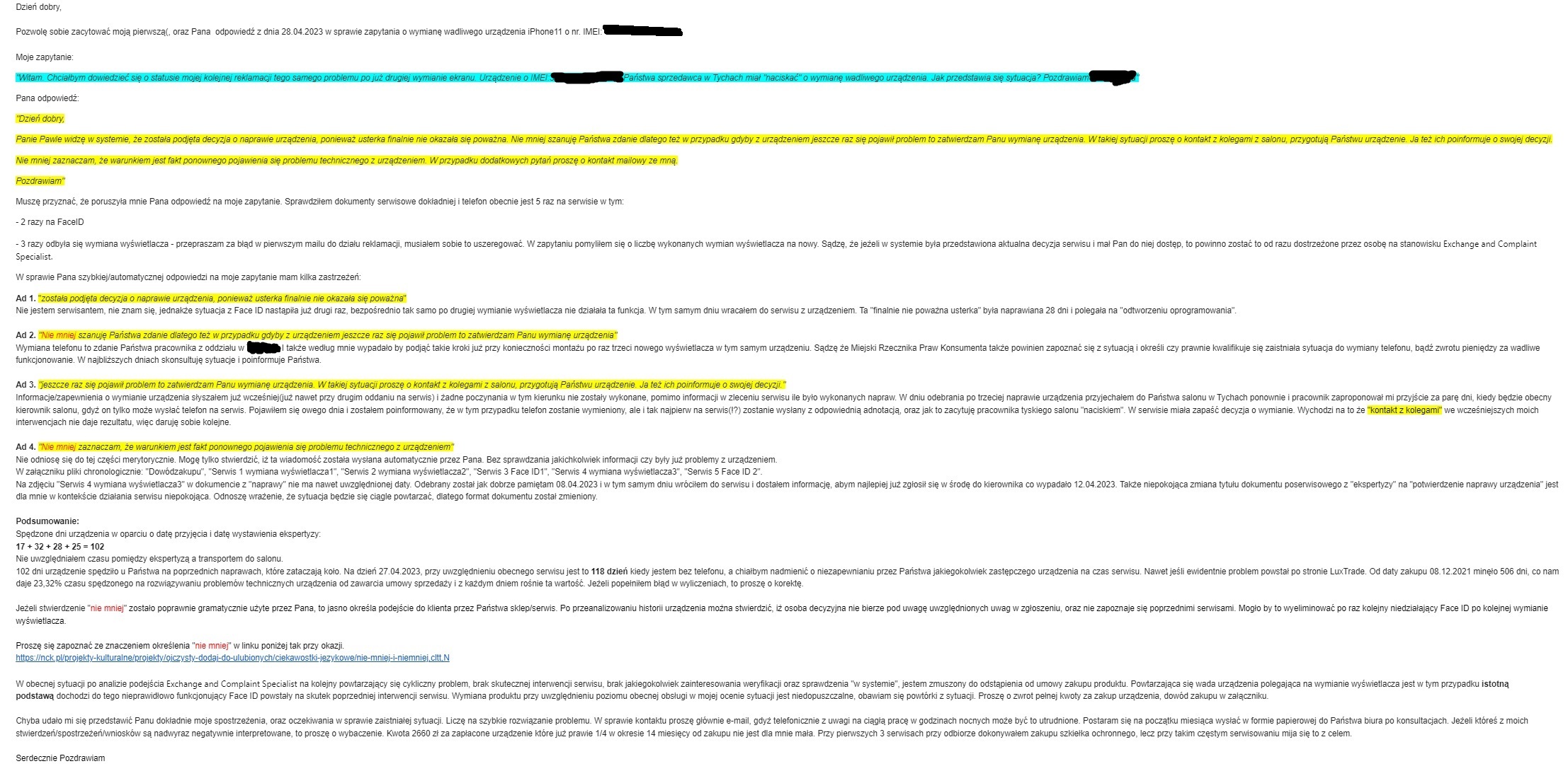 Siemka. Od jakiegoś czasu borykam się z "odnowionym" iphone. Kilka serwisów, wycieczki do sklepu, gdzie były zapewnienia już po przy drugim serwisie o wymianie urządzenia. Napisałem maila z zapytaniem i coś mnie poruszyło na tyle po otrzymaniu odpowiedzi od Exchange and Complaint Specialist, że postanowiłem troszkę dokładnie przeanalizować sprawę. Troszkę dużo czytania ale chciałem aby sprawa była