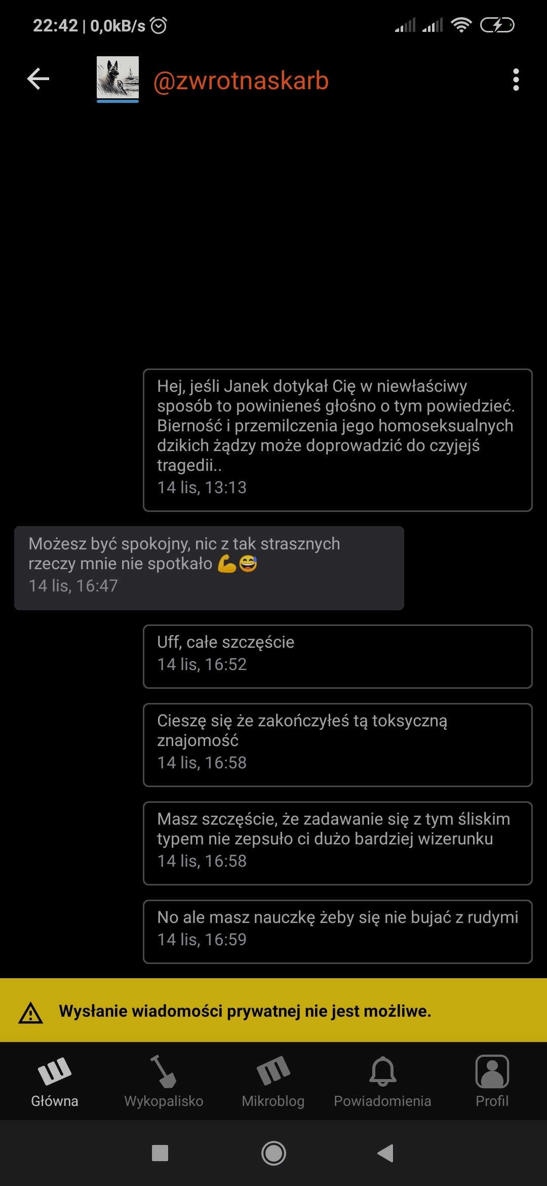 #zwrotnaskarb chłopie, siedzisz w busie odizolowany od rzeczywistości, dzień marnujesz na stalkowanie wykopu gdzie się wyżywasz a następnie na NĘKANIE zgodnie z 190a kk swoich podstarzałych widzów których notorycznie skubiesz z rentek, emeryturek i chudych etatowych pensji którymi tak gardzisz. Przykro mi łukaszku, otoczenie musi się dowiedzieć o twoich pogłębiających się problemach nim dojdzie do tragedii jak w wypadku dzbanka #yanek