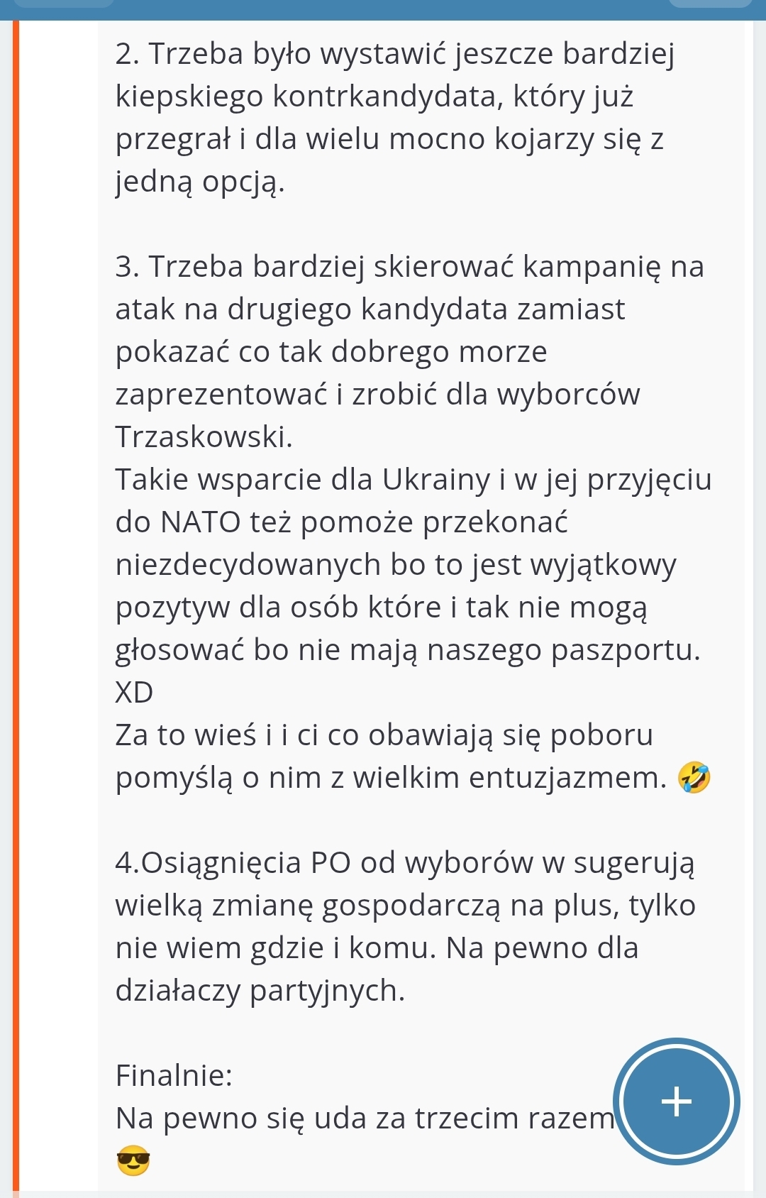 @konradpra: po prostu widzę literówki i uważam że jeśli komputer/telefon podświetla ci na czerwono jak coś źle napiszesz to nie powinno się tego ignorować. Na treść i argumenty nie patrzę - głosowałem na SZ.P Doktora Karola Nawrockiego i dla mnie liczy się bezwzględna wygrana, władza absolutna oraz polityczne zutylizowanie drugiej strony. POzdrawiam