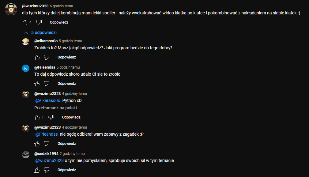 @MackoNs: Wiele osób tam siedzi i część zagadek została rozwiązana. Odtwórz ten film w prędkości 0,25 i uważnie oglądaj. Jak potrafisz, pobierz plik i sprawdź spektogram. W poprzednich filmach właśnie tam były ukryte teksty. Jest jeszcze jedno, ten zaszumiony obraz rodem z VHS też da się "naprawić" ale nie wiem jak.