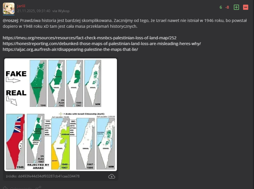 chce wspierać "słabych i wychudzonych" Palestyńczyków zamiast Żydów.