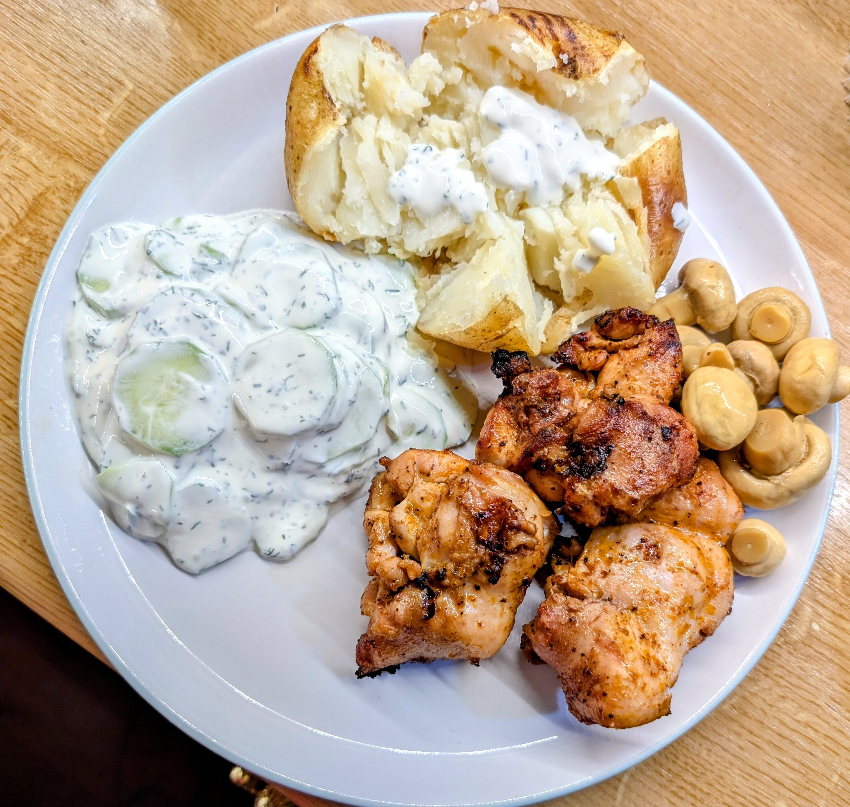 Kurczaki z grila, mizeria, pieczony ziemniak. Marynowane grzyby.