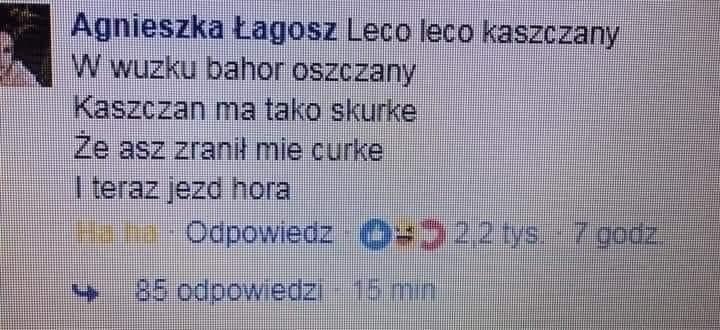 dos_badass dos_badass 29.09.2023, 22:03:36 via Wykop 12 @panpajong: Leco leco kaszczany,W wuzku bahor oszczany,Kaszczan ma takom skurke,Że asz zranił mie curke.I teraz jezd hora.Pokaż spoiler Sztywnesutkiszatana przema1990 leeaxe bartlomiej_rakowski SebekSewastopolski +7 innych