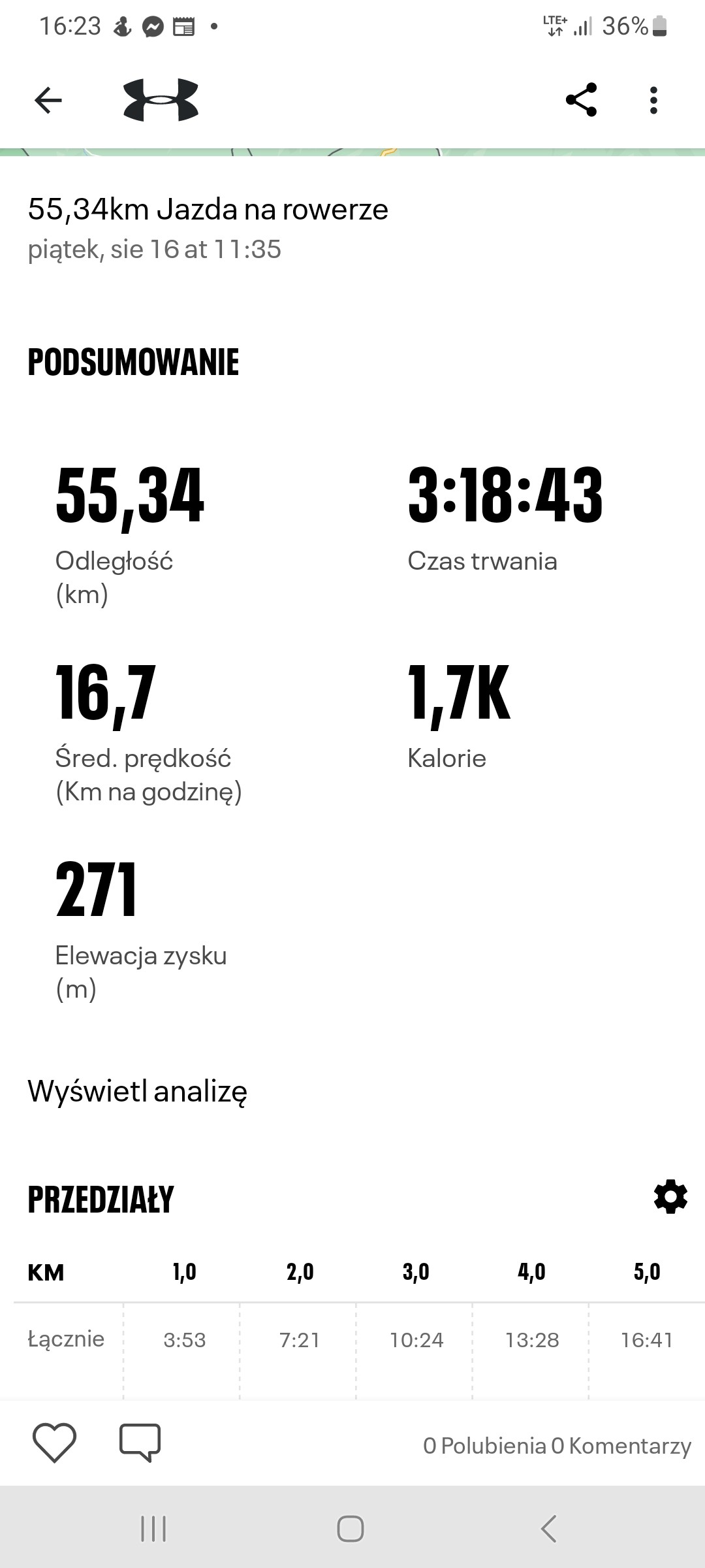 Po wczorajszym przetyraniu w upał myślałem że dziś będę miał obrzydzenie do roweru, ale widząc jak fajnie się o 19 zrobiło chłodniej, postanowiłem i dziś zrobić rundkę +30kmh, tym razem o połowę krótszą. Weszło dużo łatwiej niż wczoraj, mimo że nogi ciężkie. Tętno jednak dużo "normalniejsze", trzeciej strefy najwięcej.