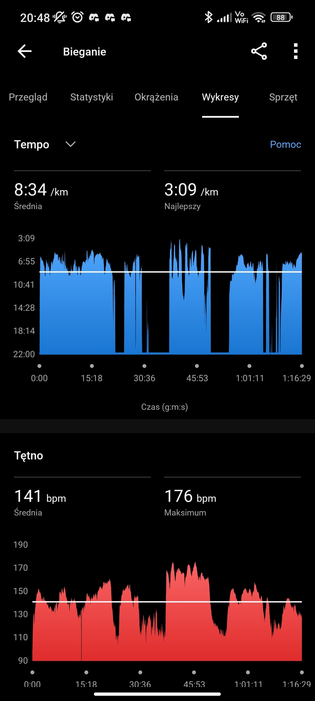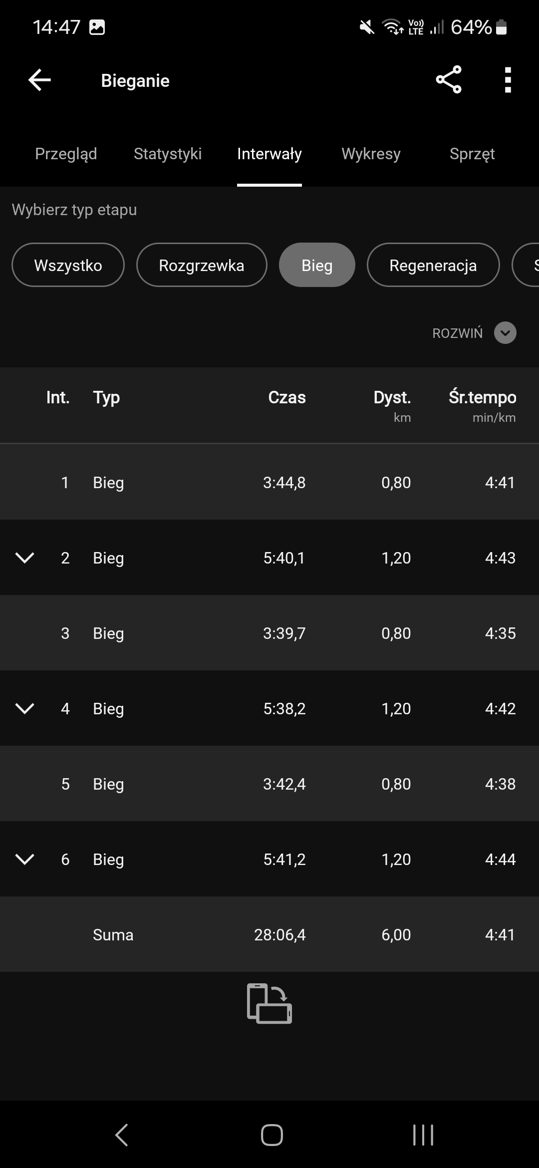 Wczoraj BS, wyszło 7km, dzisiaj zaś wymyśliłem sobie rytmyʕ•ᴥ•ʔ 0,8km 4:50/km +0,4km 6:45/km + 1,2km 5:00/km + 0,6km 6:55/km - weszło nawet szybciej (。◕‿‿◕。)