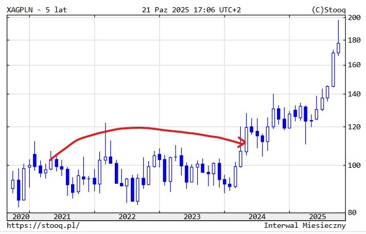 Srebro podrożało o ponad 76% od początku stycznia (wyceniane w dolarze). W szczytowym momencie wzrost przekraczał grubo ponad 80%. Cena w PLN zwiększyła się w tym samym czasie w nieco mniejszym stopniu, bo o około 56% (z uwagi na duży spadek kursu USD/PLN).