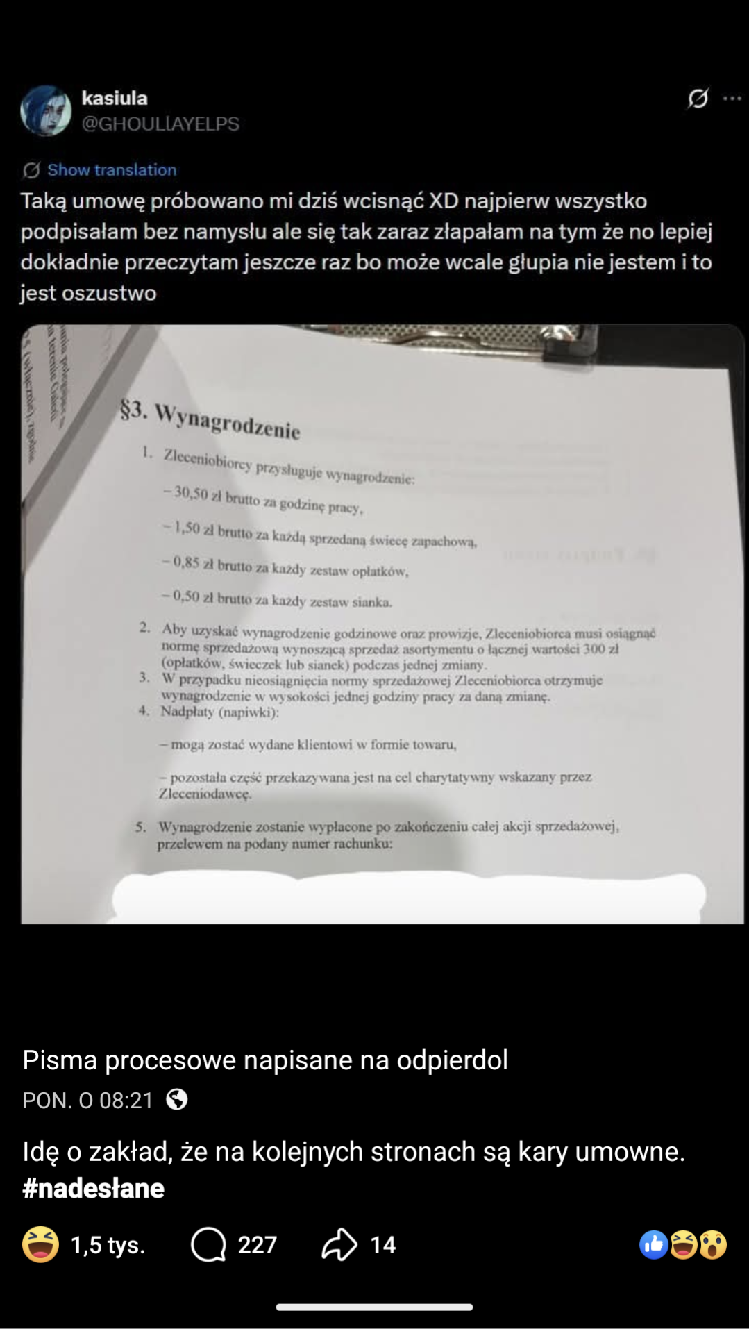 Aż powiało świąteczną atmosferą z tej umowy, moim faworytem jest cel charytatywny wskazany przez zleceniodawcę xD