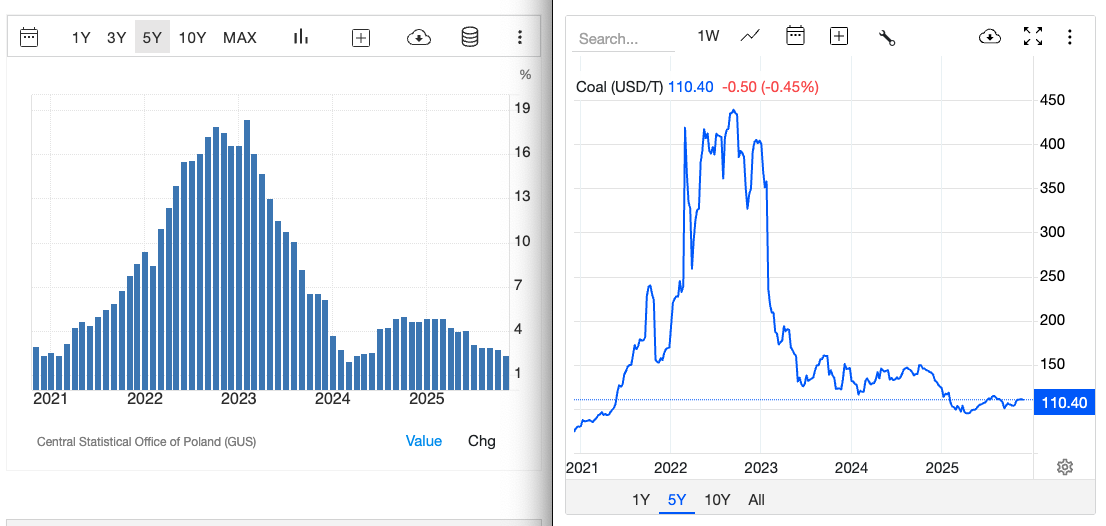 2. cena węgla znacznie spadły względem 2022 (https://pl.tradingeconomics.com/commodity/coal)