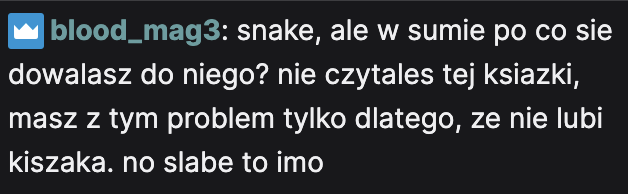 @helloWisconsin: yep, kazał kiszak od razu "wypi3rdalać". Ale widz odpisal, ze sam ma wypi3rdalać. plus taki ze bana nie dostal u wężozjada