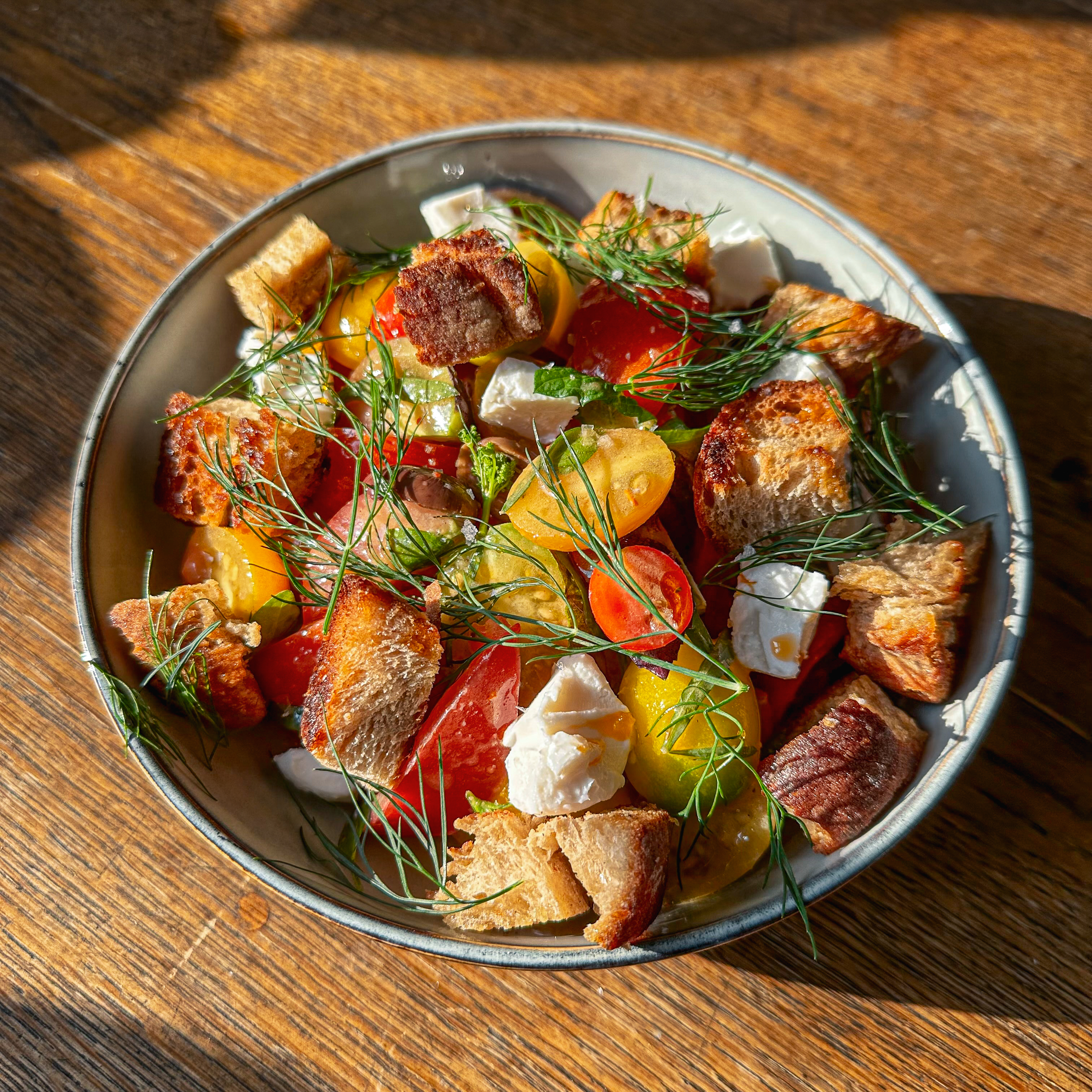 4 rodzaje pomidorów z ogródka, ziółka, oliwki, grzanki, trochę sera koziego i winegret.