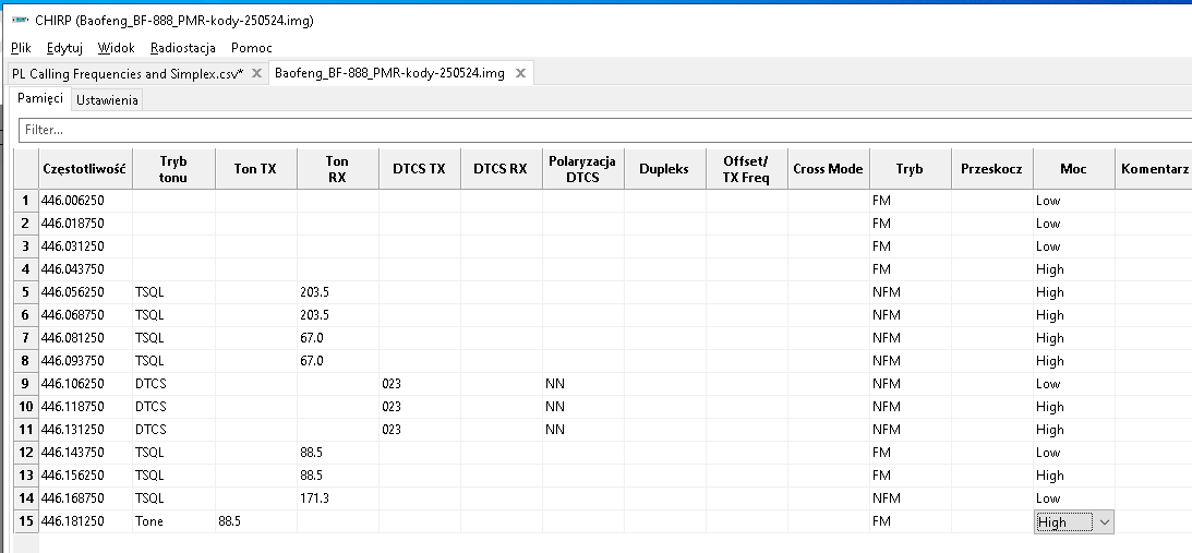 Za pomocą programu CHIRP ustawiłem kanały od 446.00625.