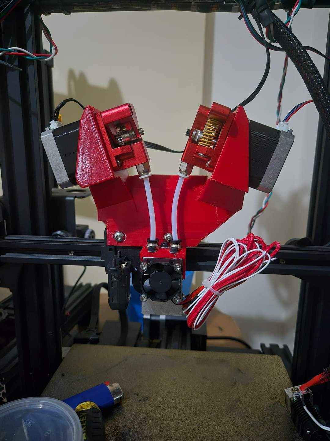 ciekawy jestem jak to wygląda za tym wiatrakiem. za mało miejsca na Y z tych rurek, więc pewnie 2 hotendy są i wtedy ciekawe jak jest rozwiązana kwestia poziomu 2 dysz. musiałyby być idealnie na tej