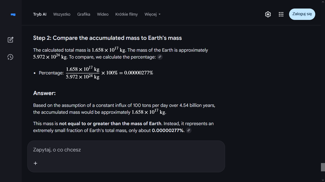 AI twierdzi, że każdego dnia na Ziemię spada około 100 ton asteroid i pyłu kosmicznego. Czy to dużo? Niby tak, ale okazuje się, że jednak nie, bo gdyby tyle samo spadało przez 4.54 miliarda lat (wiek Ziemi), to całkowita masa tego co spadło na Ziemię przez ten czas (4.54 miliarda lat) byłby nieznaczącym ułamkiem masy Ziemi. Zrobiłem też screen'a.