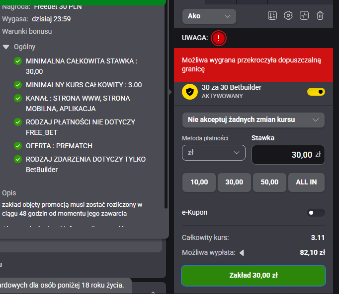 Fortuna ostatnio nałożyła mi blokadę na konto i nie mogę obstawiać zakładów jeżeli na kuponie jest jakikolwiek bonus xD wyświetla się wtedy komunikat "możliwa wygrana przekroczyła dopuszczalną granice" Napisałem do nich o co chodzi, to odpisali mi, że taki jest zapis w regulaminie, że mogą odmówić zawarcia zakładu bez podawania powodu i nara xD