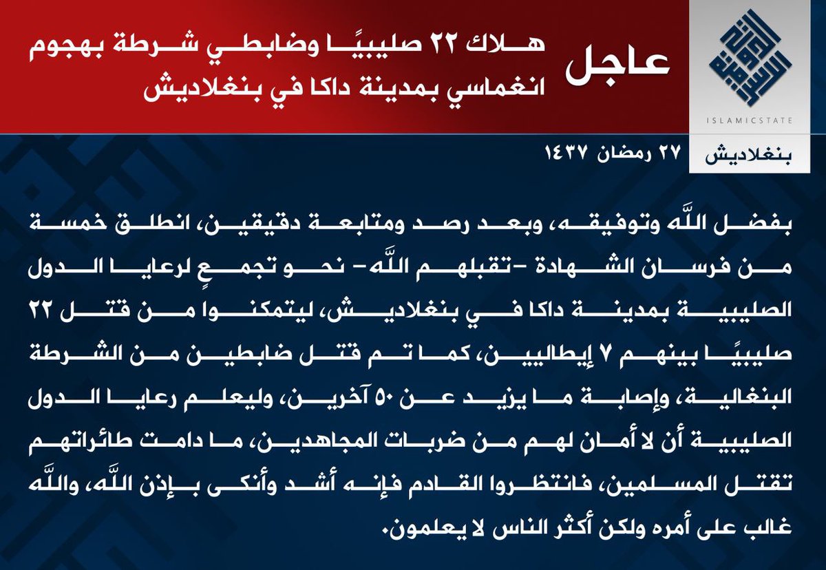 IS dokonał zamachu na restauracje w stolicy Bangladeszu. W oficjalnym komunikacie mowa jest o zabitych 24 krzyżowcach, w tym 2 policjantach oraz 50 innych rannych.