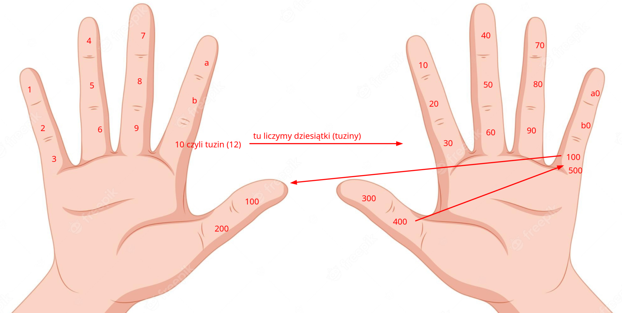 Podstawowy powód jest taki, że na palcach da się policzyć tylko do 19, a w dwunastkowym, na paliczkach da się policzyć nawet do 500 (720 w systemie dziesiętnym). Zobaczcie przygotowaną ilustrację, jak to wyglądało.