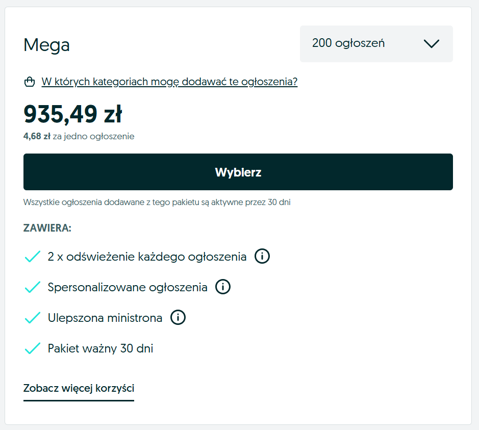 Dziś skończył mi się pakiet ogłoszeń w kategorii rowery. Chcę wykupić nowy, a tu wyskakuje mi 8 zł za ogłoszenie przy pakiecie pięciu ogłoszeń. Pojedyncze 3 zł - taniej niż w przypadku pakietu. Mogę kupić jedynie pakiet mega lub ogłoszenie premium. Nie ma już do wyboru pakietu standard.