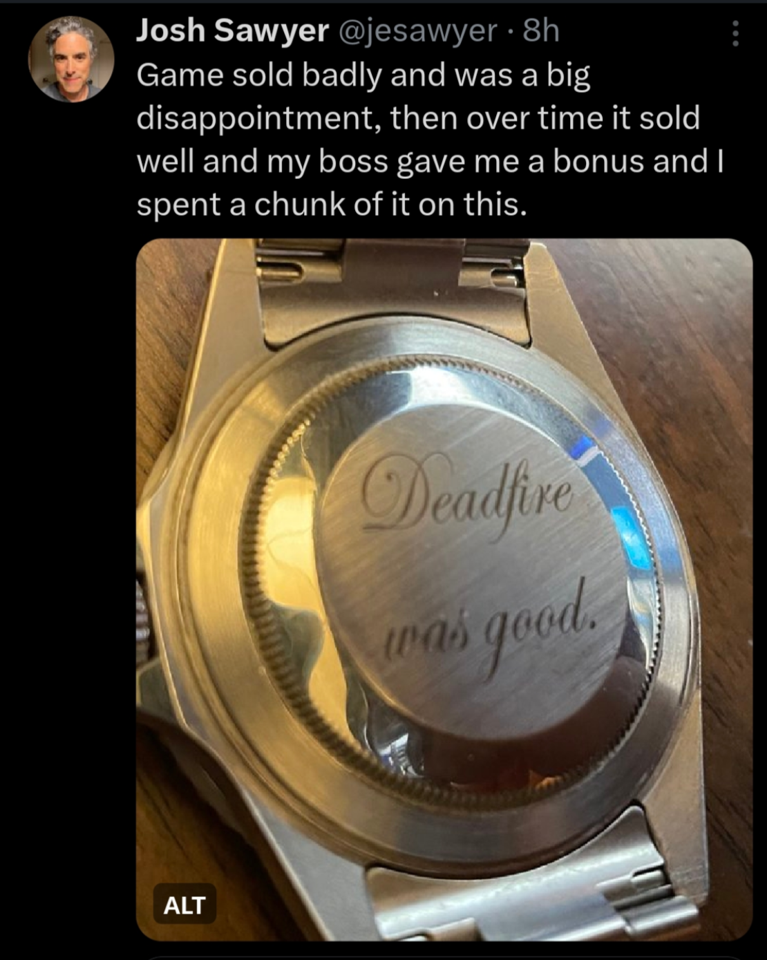 Nie wiem jak finansowo Avowed, ale PoE2 po roku już wyszło na plus. Po kolejnych paru latach zarobiło na tyle, że Sawyer dostał jeszcze za to spory bonus, którego część wydał na jakiś luksusowy zegarek z grawerem. Od czasu Deadfire pracował tylko nad Pentimentem i cieszy się z 200k $ rocznie będąc w zasadzie "testerem", który dzieli się swoimi spostrzeżeniami, które mogą ale nie muszą być brane przy produkcji innych gier w