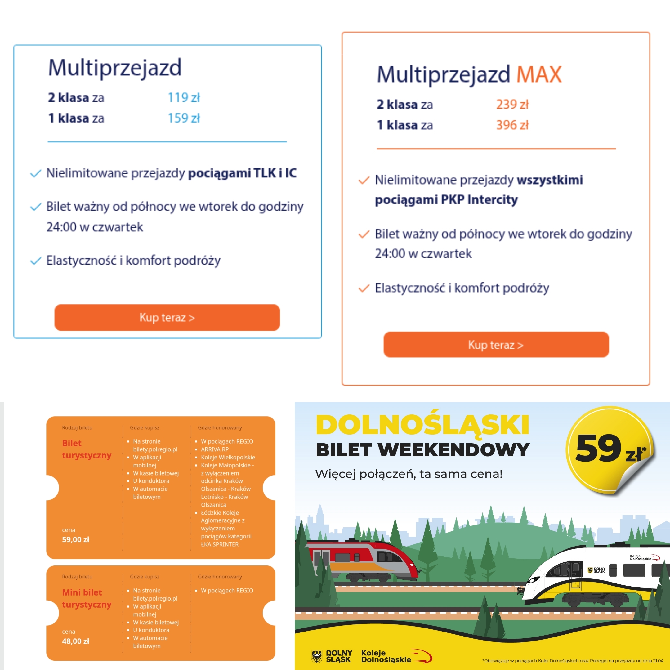Pierwsza to MultiPrzejazd / MultiPrzejazd Max czyi podróżne pociągami Intercity przez 3 dni (wtorek - czwartek). Rodzaje obsługiwanych pociągów intercity są zależne od wersji biletu. Do każdego biletu trzeba doliczyć 3 zł za każdą rezerwację pociągu.