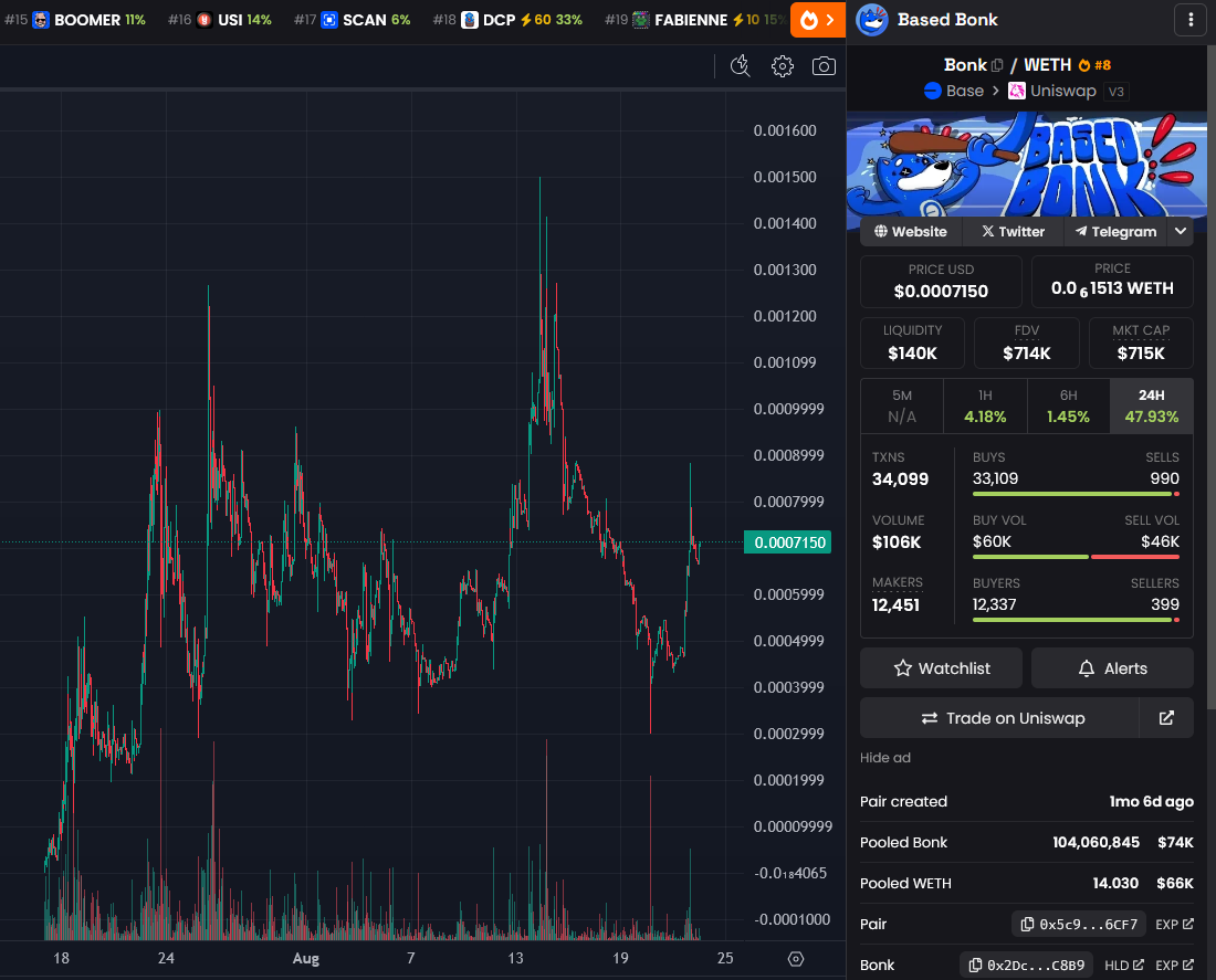BRETT (Base) – memecoin z Base, który przekroczył $1B MC i niedawno wleciał na Binance.US. Na starcie nie