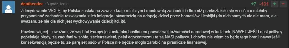Zdecydowanie WOLĘ, by Polska została na zawsze kraje rolniczym i montownią zachodnich firm niż przekształciła się w coś,c o miałoby przypominać zachodnie rozwiązania z ich imigracją, otwartością na adopcję dzieci przez homosiów i lesbijki (do nich samych nic nie mam, ale uważam, że nie dla nich jest wychowywanie dzieci) itd. itd.