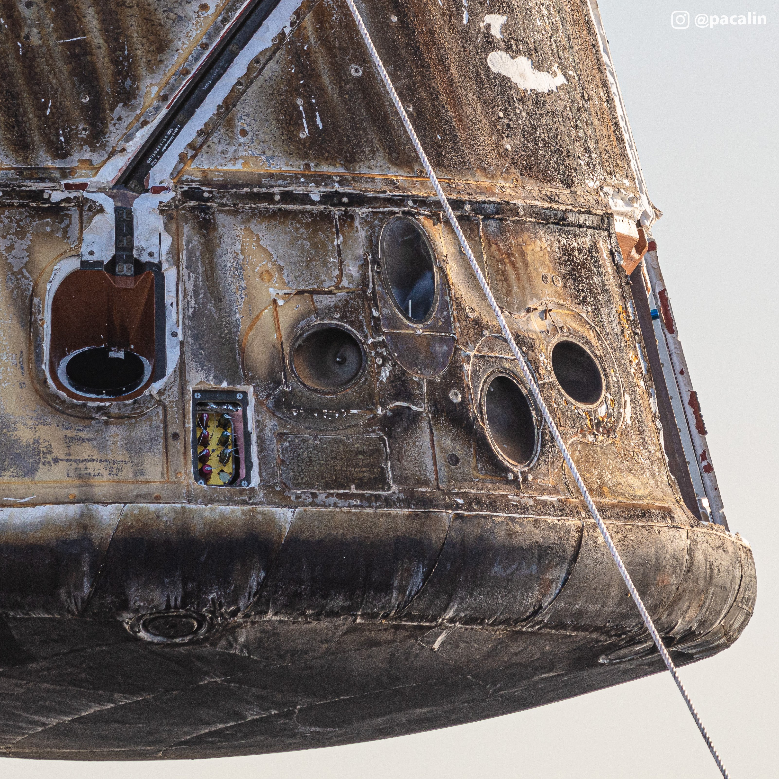 Dragon który wrócił z ISS. Na zbliżeniach widać testowane ceramiczne osłony które mają znaleźć się na Starship.