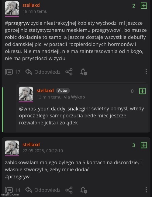 @przezwzrostprzegralemzycie: Damski przegryw - mój były, 5 związków wcześniej, kluby i wyszalenie się na karuzeli benisów. Chłop - gnicie na tagu dzień w dzień jako jedyna forma komunikacji z drugim czlowiekiem