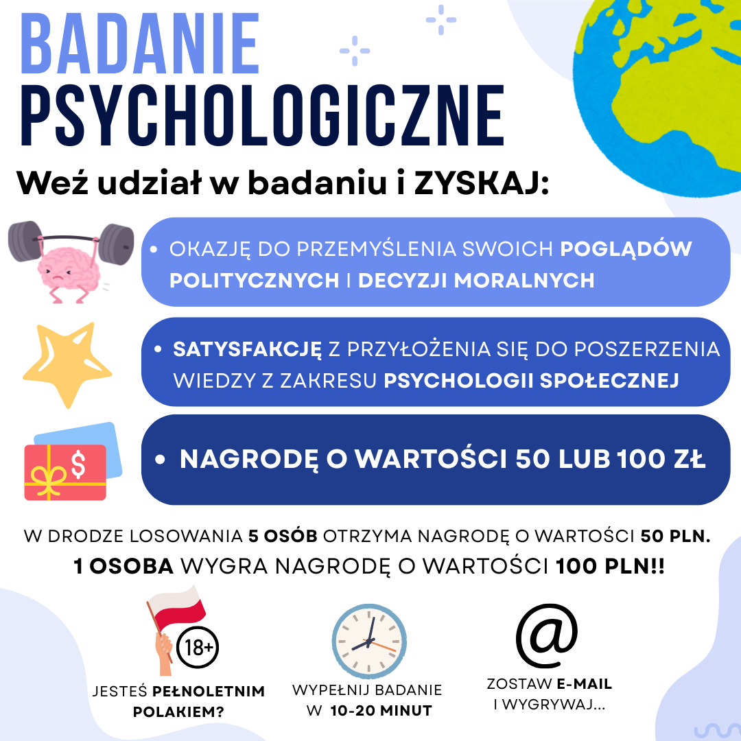 Każdy kto weźmie udział w badaniu może wziąć udział w loterii, w wyniku której 5 osób wygra 50 złotych, a jedna osoba 100 złotych! (⌐ ͡■ ͜ʖ ͡■)